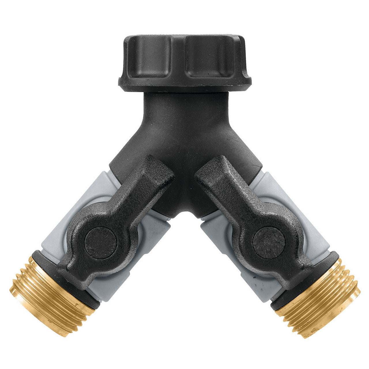 Orbit Irrigation Pro Flo Hose Y - This Pro Flo hose Y converts one hose faucet into two hose faucets, allowing you to use two hoses from the same faucet. Orbit Irrigation's easy valve controls let you adjust the flow or shut-off each hose faucet. The Orbit Irrigation 3/4" male-threaded hose splitter has a swivel head for easy install to your hose faucet. The heavy-duty metal with leak-free ball valve ensures quality hose splitter performance, giving you the option to water in different ways.