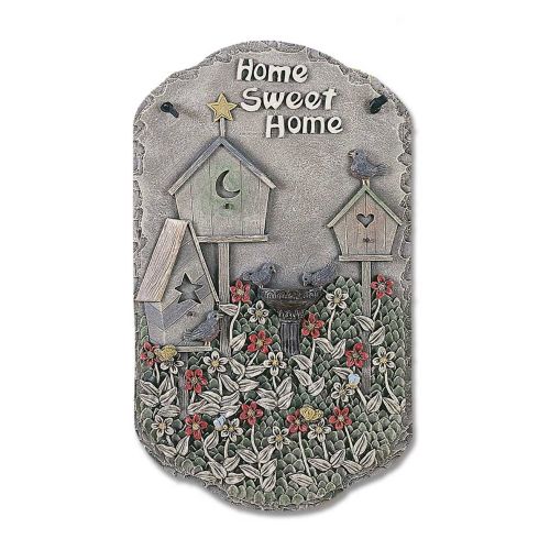 Birdbath is approximately 13"x7.75"x1" indoor-outdoor poly resin slates. This features 3 birdhouses, flowers and a birdbath and reads Home Sweet Home. This is ready to hang with a leather strap.•Women Owned (WBE)•Stonewashed•Indoor/ Outdoor Use•Copyrighted by Millwork