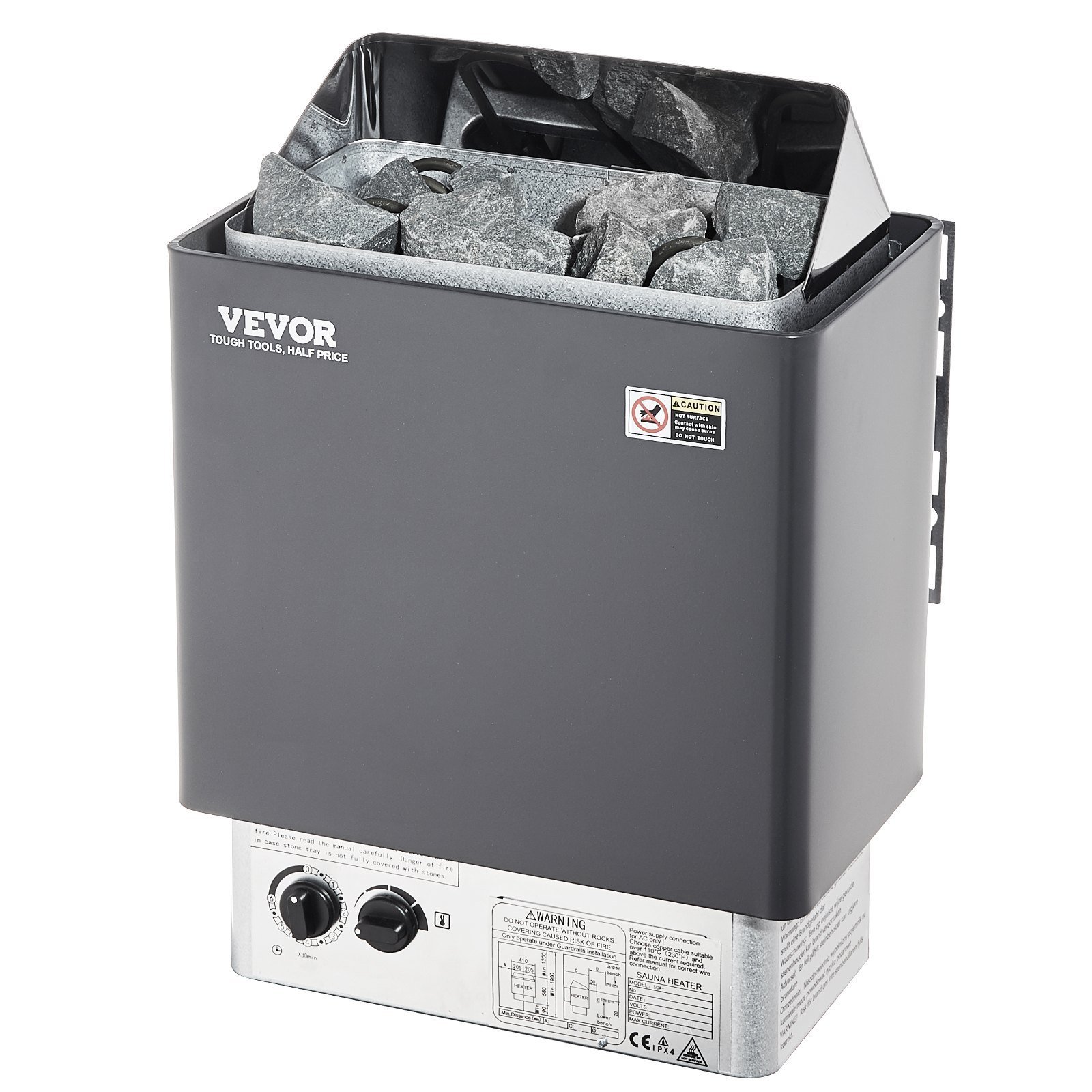 1.Fast Heating: Power: 6KW; Suitable Sauna Room: 176-318 cu.ft / 5-9 m³; Dimension: 16.1'' x 10.6'' x 22''. Sauna Stones Need: 33 lbs / 15 kg. Note: Sauna stones are NOT INCLUDED. The ample stone capacity allows the stones to absorb and store heat, ensuring effective heat retention and dispersion.